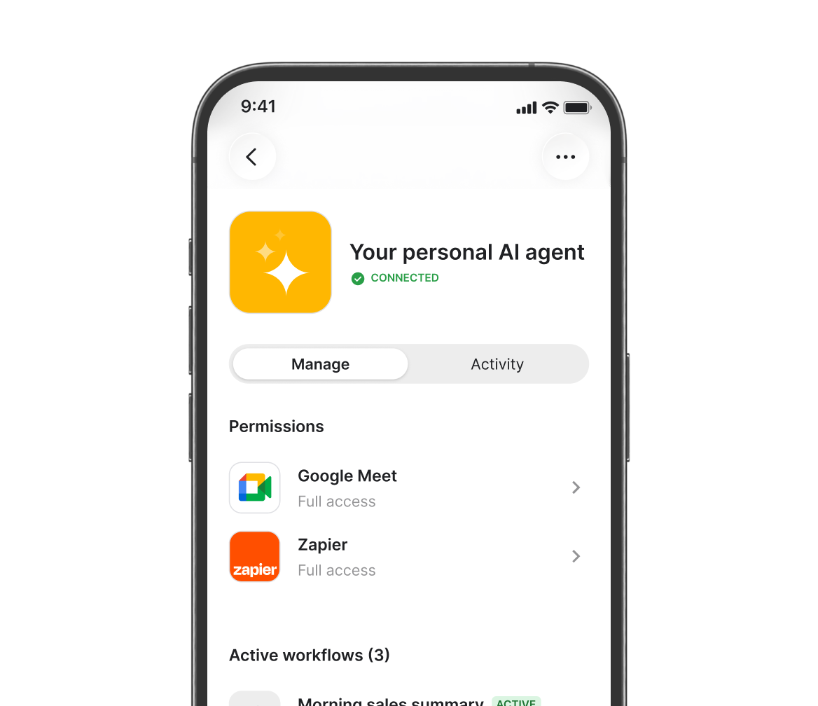From day one, your personal work agent starts proactively suggesting what it can do for you and tells you what it needs to connect it to your other tools.