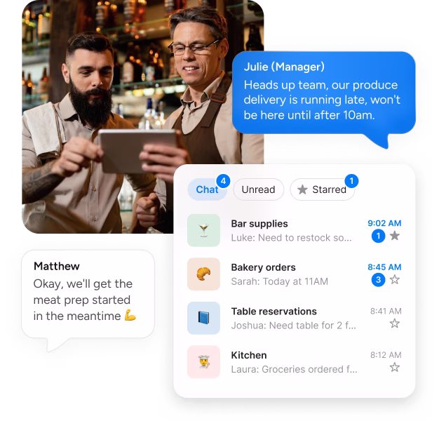 Stop hunting through five different group chats. Create separate chats for your Kitchen, Servers, different locations, or managers only, so the right people see the right messages.
