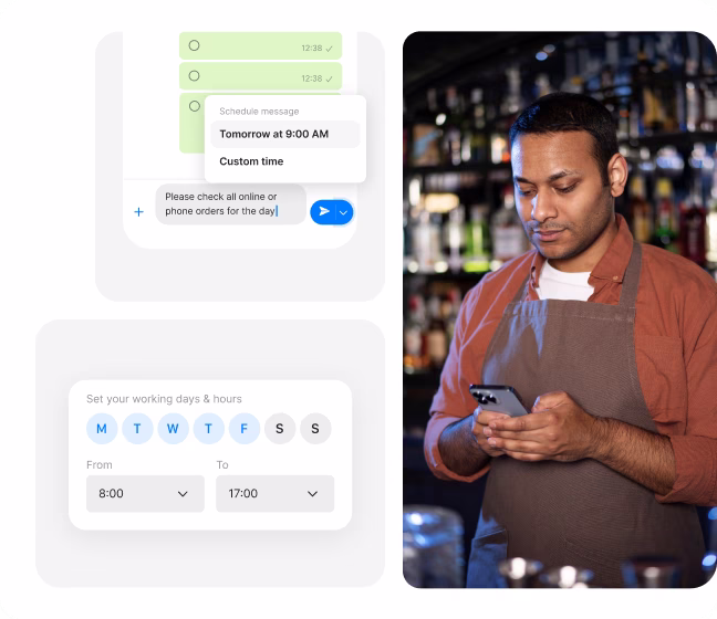 The "always-on" culture drives burnout in the food service industry. Zenzap stops the 24/7 texts flooding your team's personal apps by limiting notifications to working hours, so they only get alerts when they're on the clock.