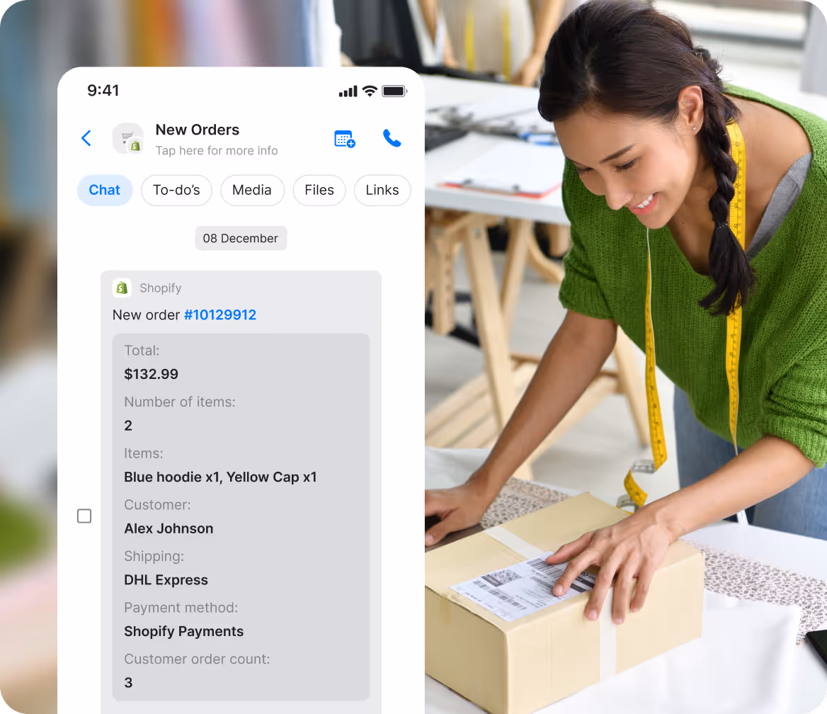 Connect your tools to get automatic updates about sales, support, and projects right inside your chats. No more checking other apps to know what's going on.