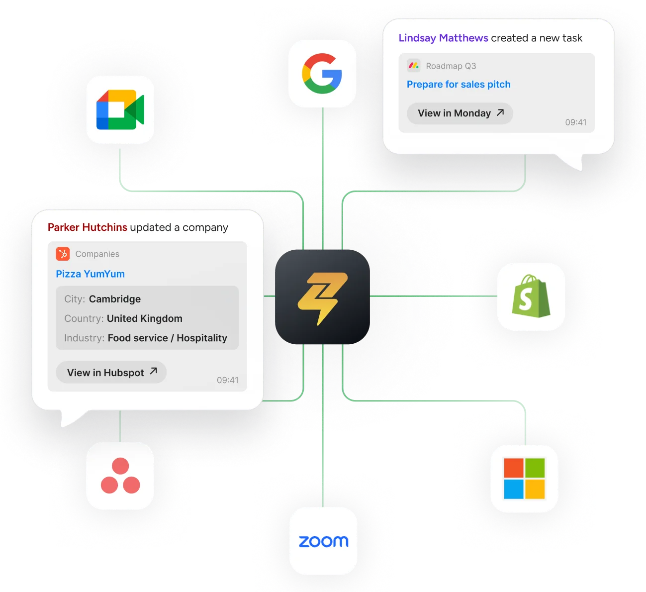 Stop switching between apps. Get automatic updates from the tools you use every day, right in your Zenzap chats. From new sales to project updates, your whole team can see what's happening in one place.