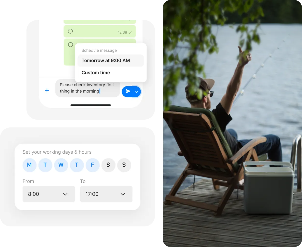 Put an end to the "always-on" culture that leads to burnout. Scheduled messages and working hours mean your team can actually disconnect when they’re off the clock.