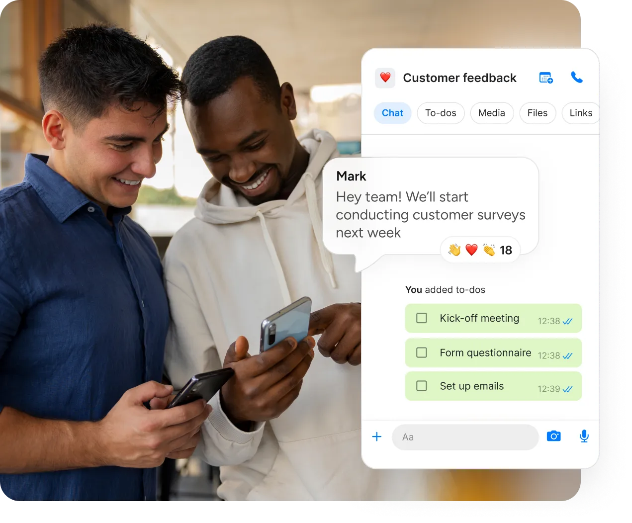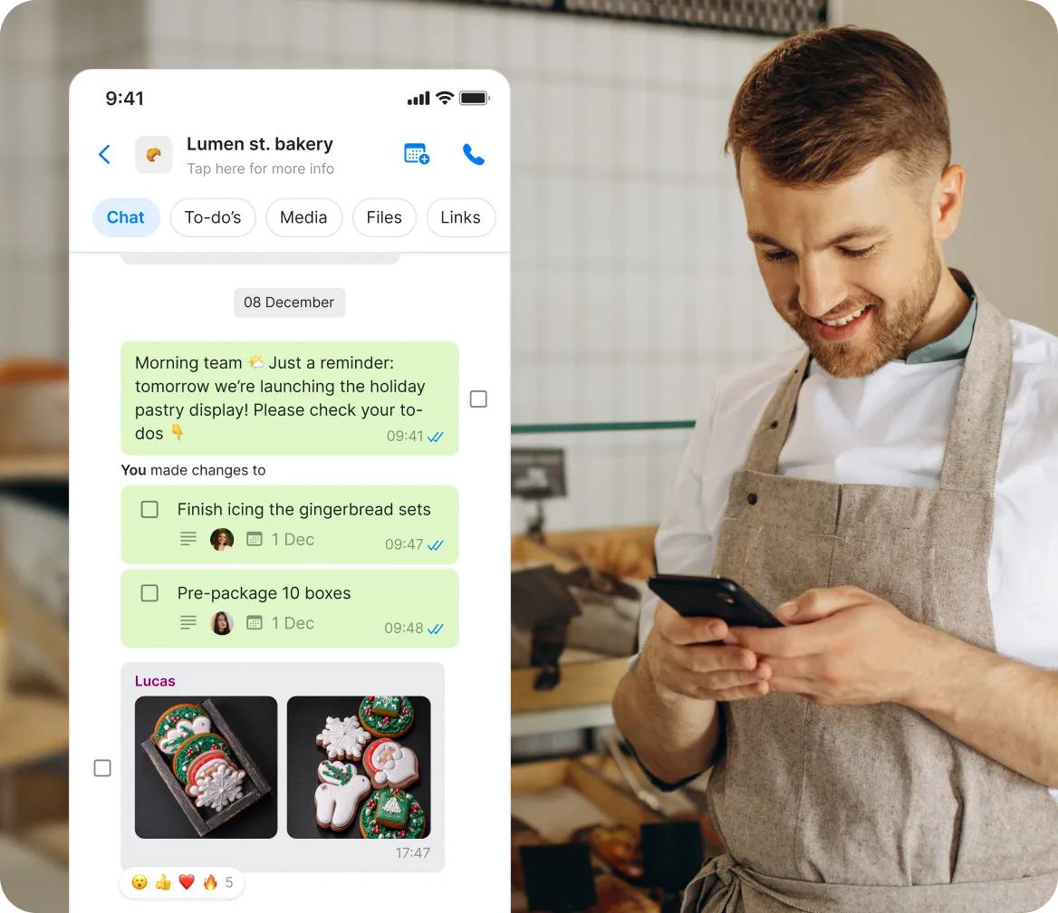 Keep your team accountable. Turn any message into a trackable task within the chat, ensuring important updates aren’t missed or ignored.